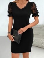 Kadın Kısa Kollu V Yakalı Dantel Detaylı Kısa Ithal Krep Elbise
