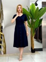 Kadın Kısa Kollu V Yakalı önden Düğmeli A Kesim Dokuma Elbise