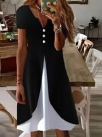 Kadın Kısa Kollu V Yakalı önden Düğmeli çift Renkli Viskon Elbise