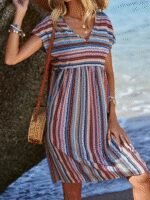 Kadın Kısa Kollu V Yakalı Pile Detay Keten Elbise