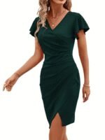 Kadın Kısa Kollu Volanlı Kruvaze Yaka Yanlardan Büzgülü Ithal Krep Elbise