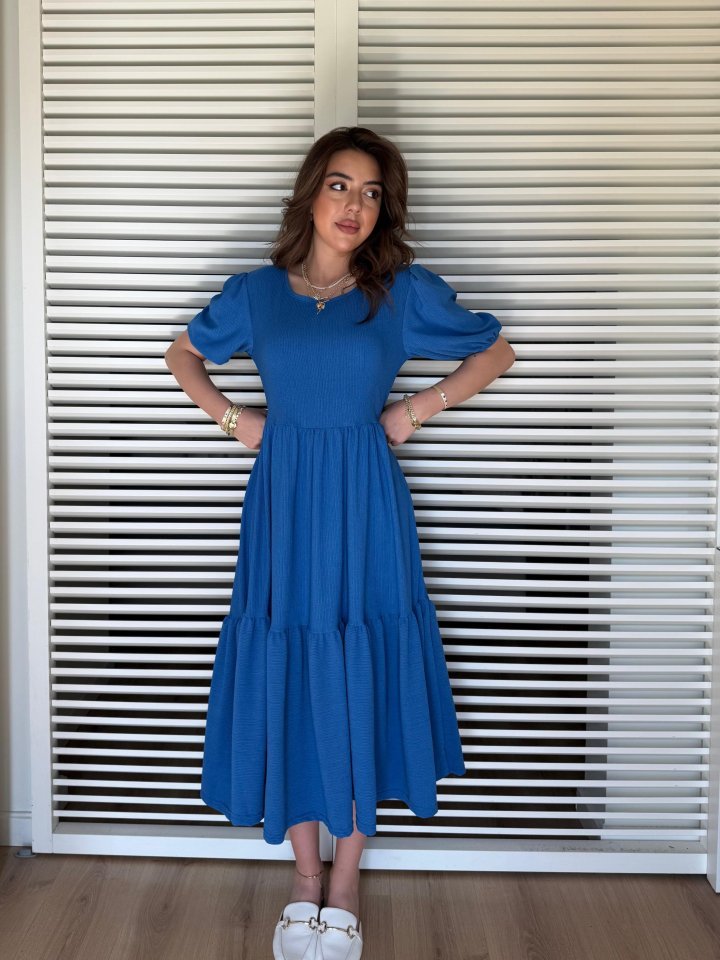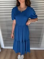 Kadın Kısa Kollu Bisiklet Yaka Belden Lastikli Midi Viskon Elbise