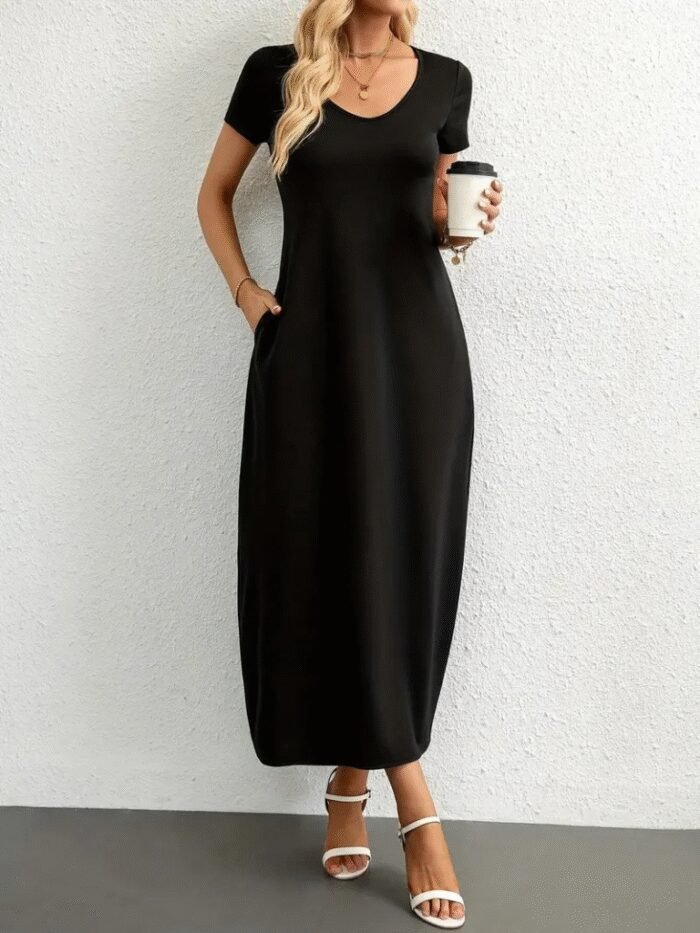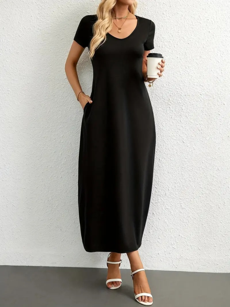 Kadın Kısa Kollu Yakası Yuvarlak Cepli Viskon Elbise
