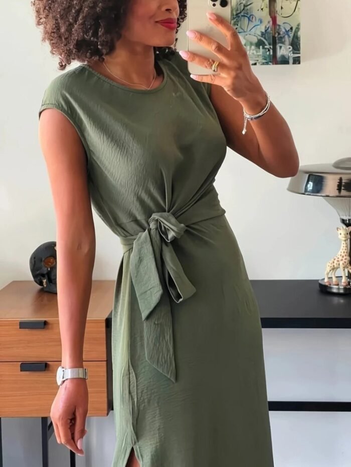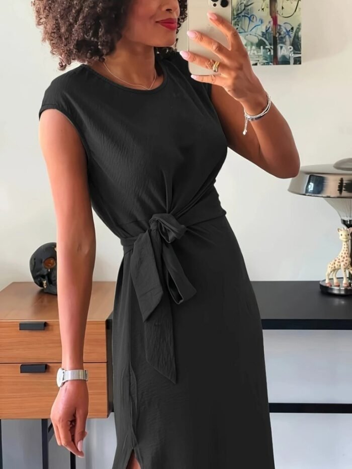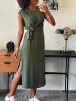 Kadın Kısa Kollu Yuvarlak Yaka Belden Bağcıklı önden Yırtmaçlı Aerobin Elbise