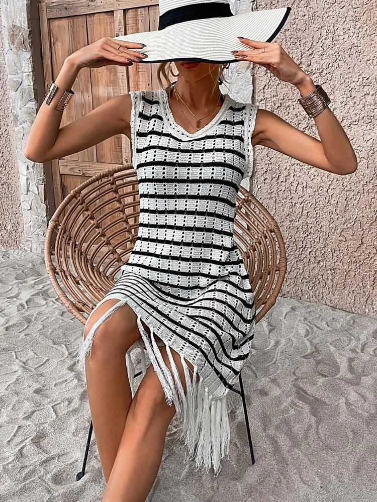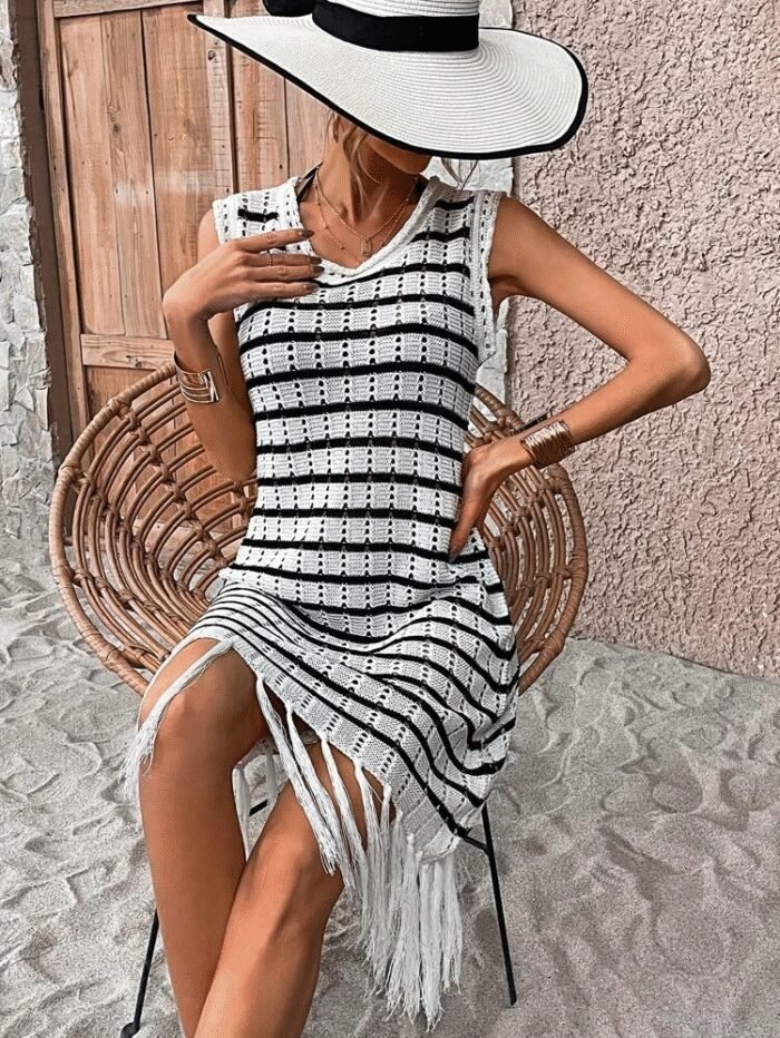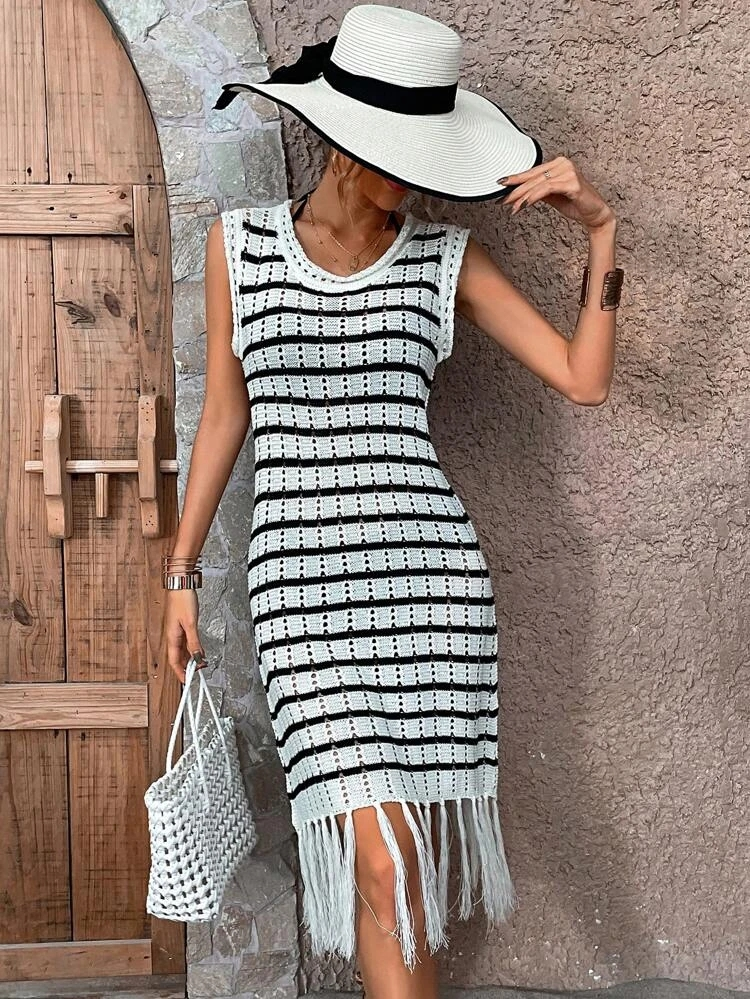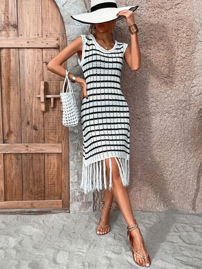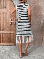 Kadın Kolsuz V Yaka Eteği Püsküllü çizgi Desen Triko Elbise