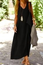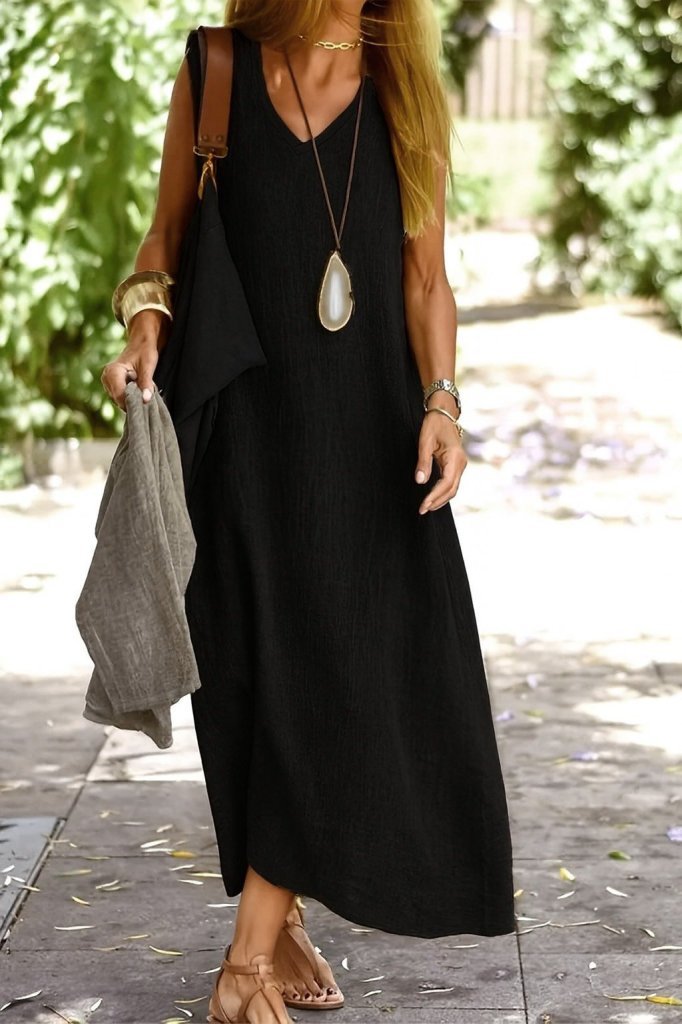 Kadın Kolsuz V Yakalı Maksi Boy Ithal Keten Elbise