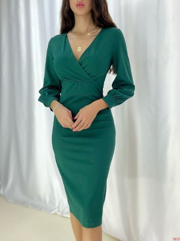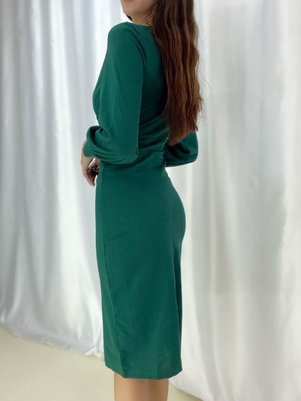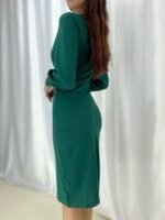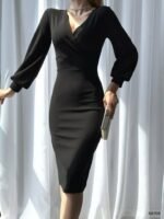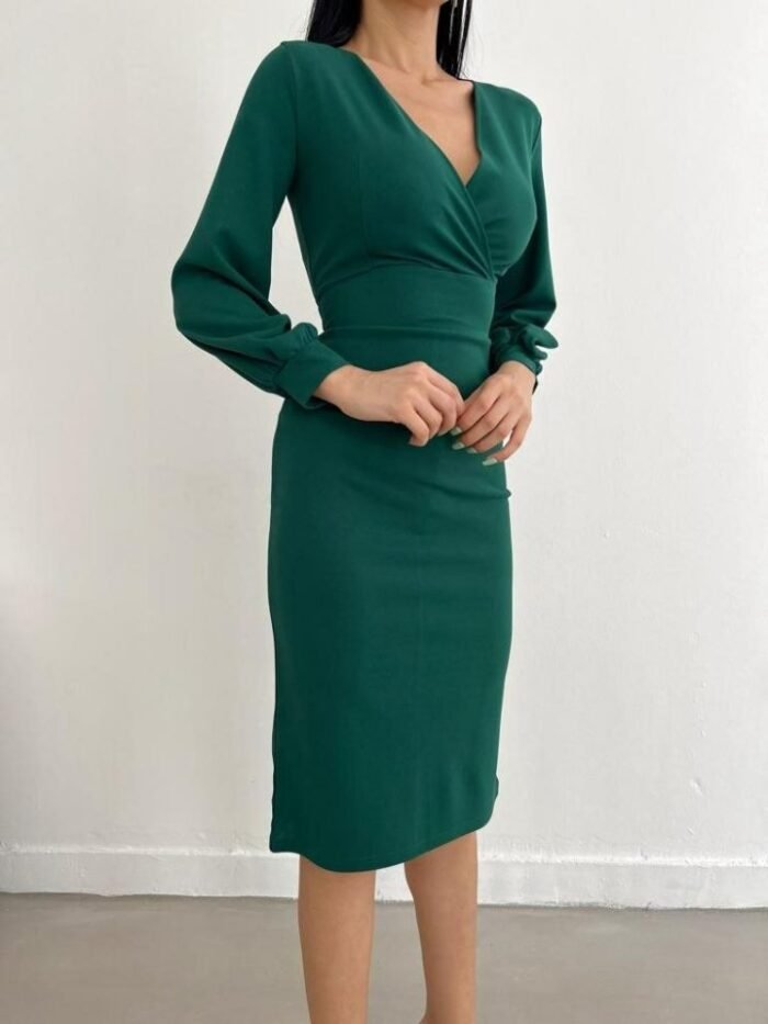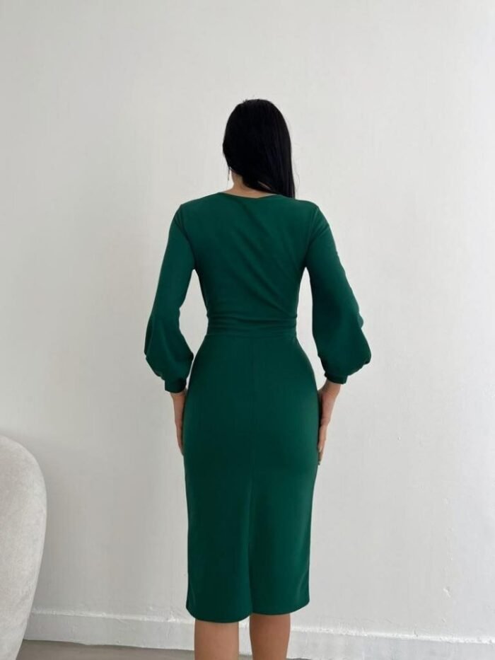 Kadın Kruvaze Yaka Balon Kol Midi Boy Elbise