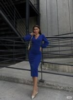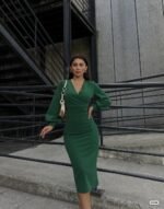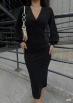 Kadın Kruvaze Yaka Balon Kol Simli Krep Kumaş Midi Boy Elbise