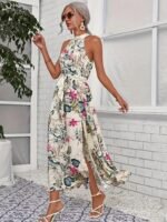 Kadın Omuzlardan Açık Halter Yakalı Yırtmaçlı çiçek Desenli Süprem Elbise