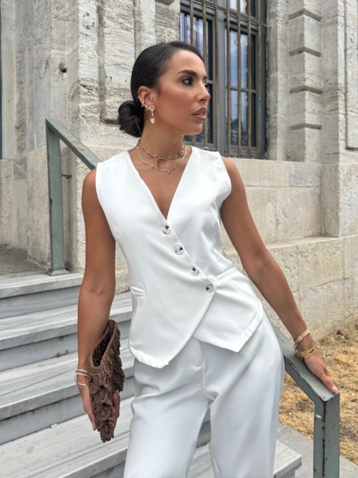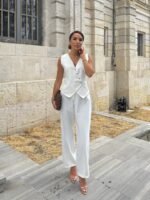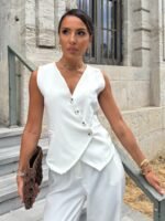 Kadın Sıfır Kollu çapraz V Yakalı önden Düğmeli Atlas Yelek Ve Pantolon Ikili Takım