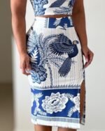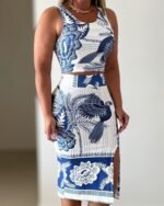 Kadın Sıfır Kollu Yuvarlak Yaka çiçekli Desenli Süprem Crop Ve Yırtmaçlı Etek Ikili Takım