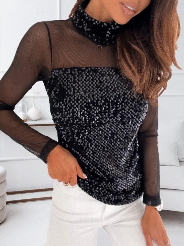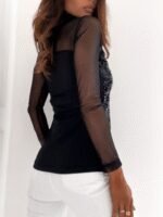 Kadın Siyah Uzun Kollu Kolları Ve Dekolte Tül Ve Payet Detay Balıkçı Yaka Bluz
