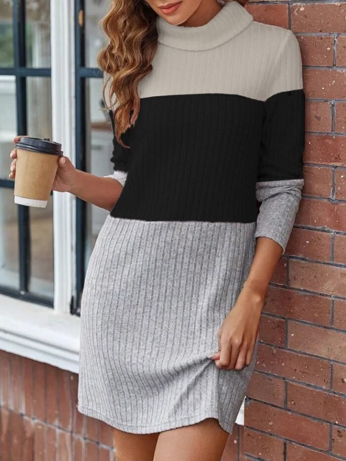 Kadın Uzun Kollu Balıkçı Yaka çizgili çok Renkli Mini şardonlu Kaşkorsel Elbise
