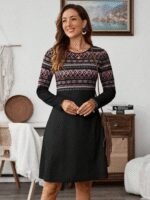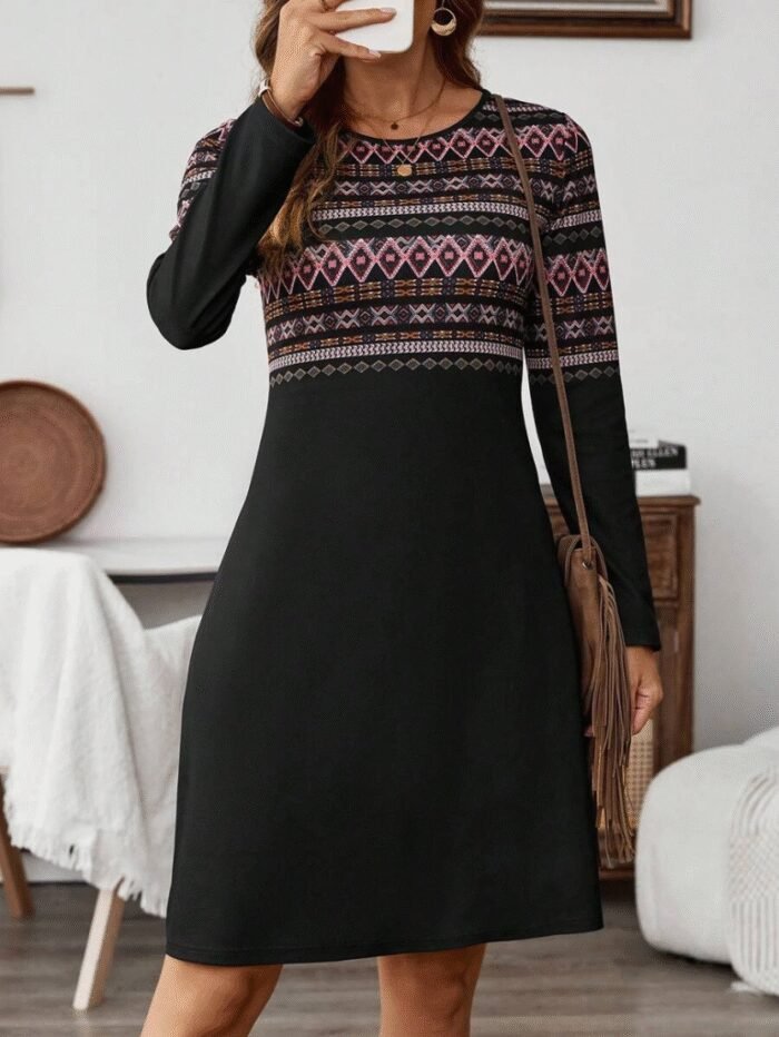 Kadın Uzun Kollu Bisiklet Yaka Etnik Desenli Kısa şardonlu Dalgıç Elbise