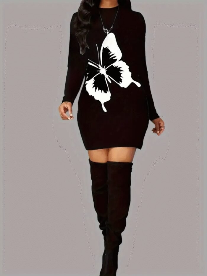 Kadın Uzun Kollu Bisiklet Yaka Kelebek Desenli Kısa Viskon Iki Iplik Elbise