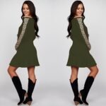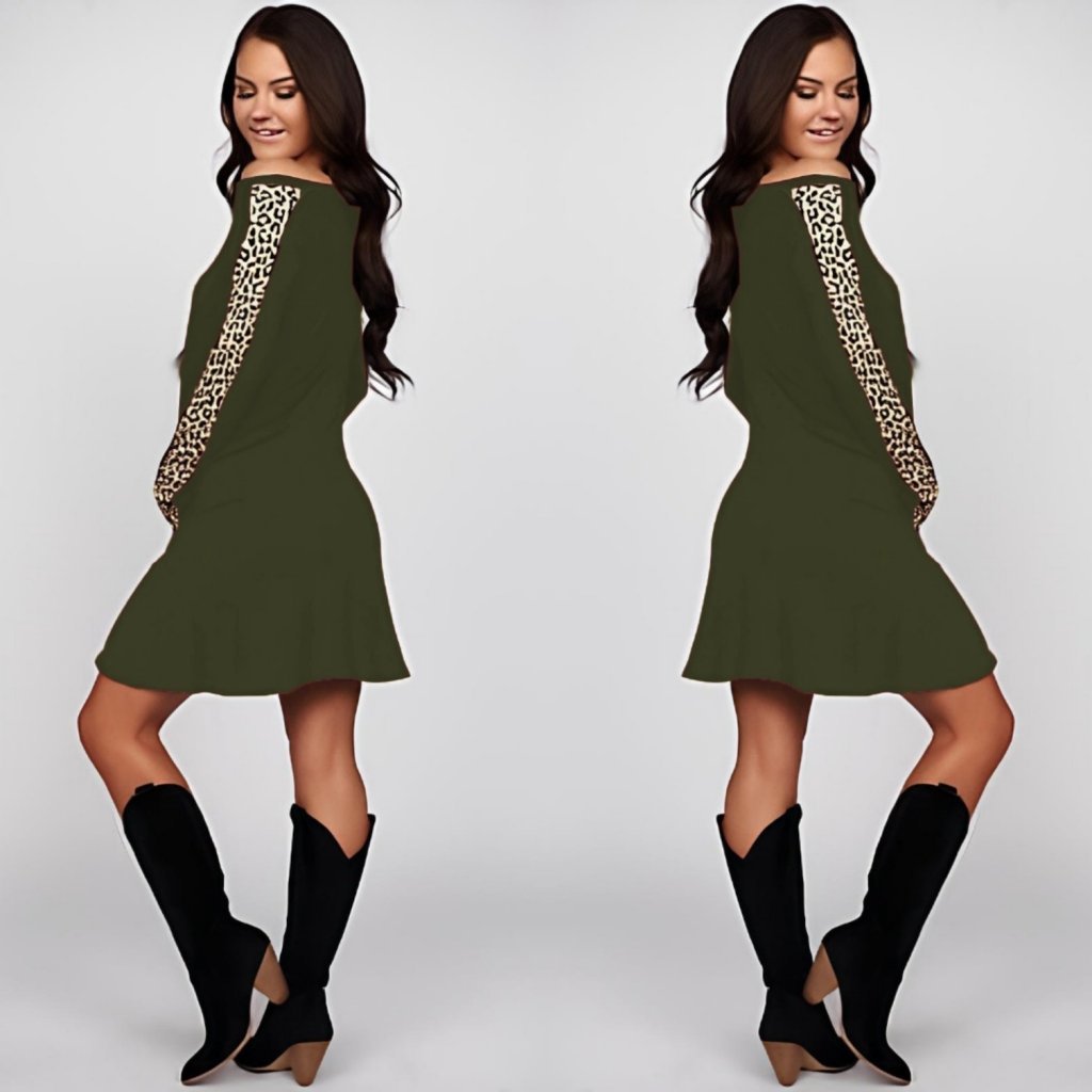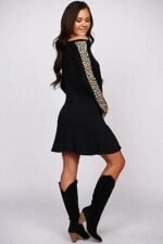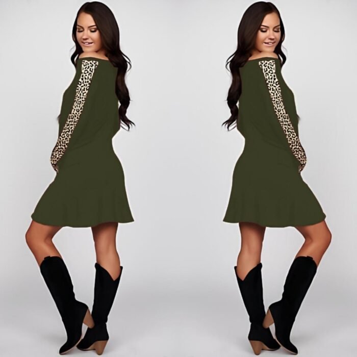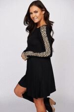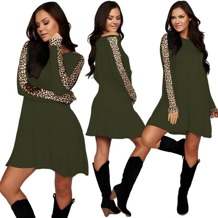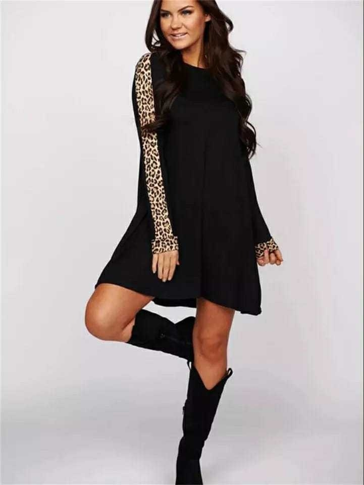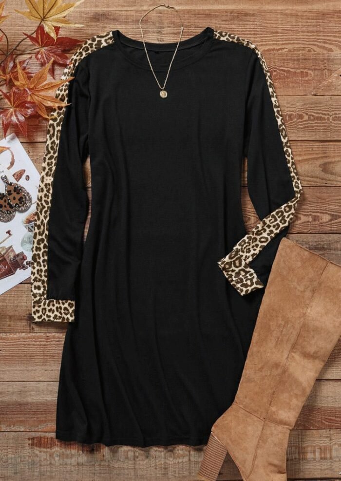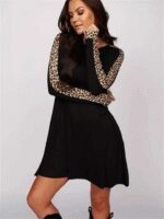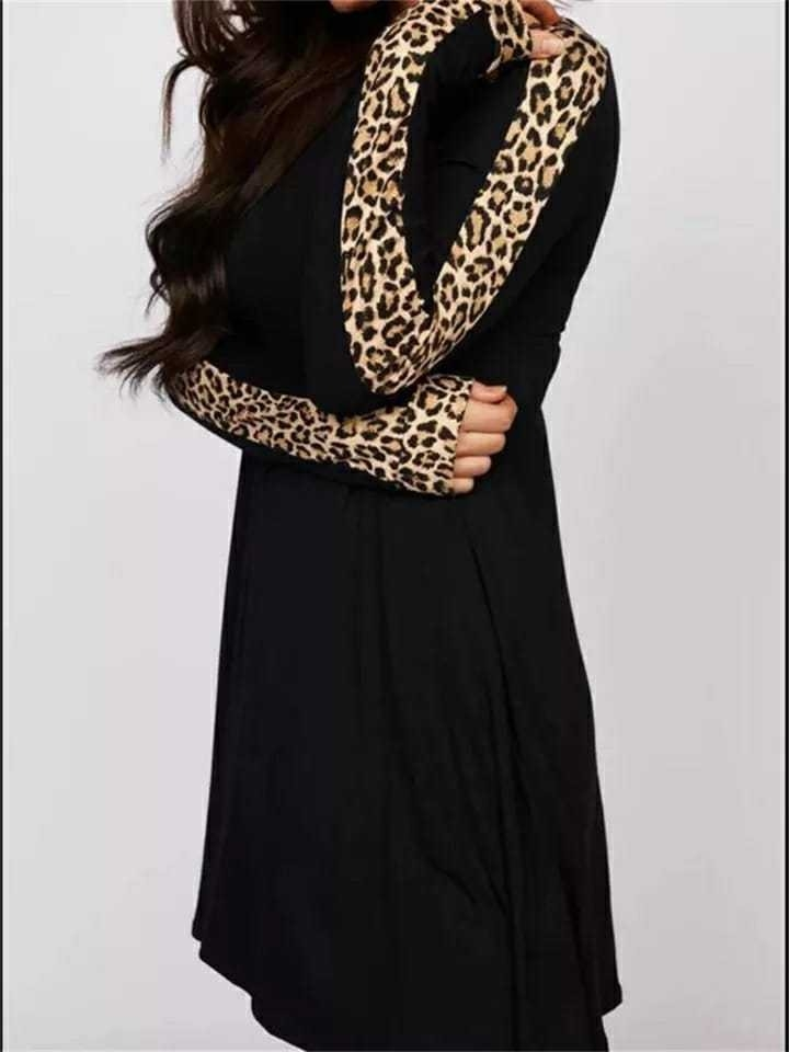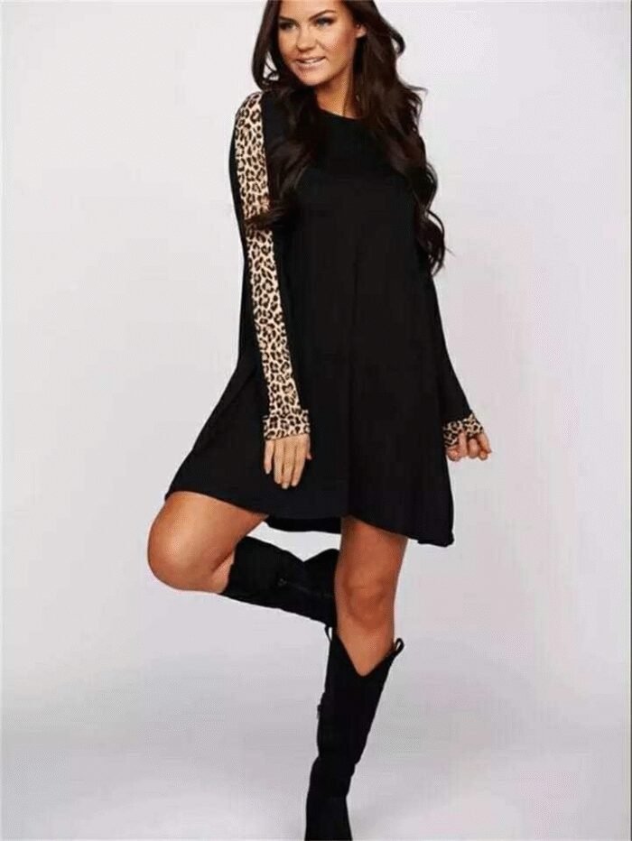 Kadın Uzun Kollu Bisiklet Yaka Kollar Leopar Detay Iki Iplik Mini Boy Elbise