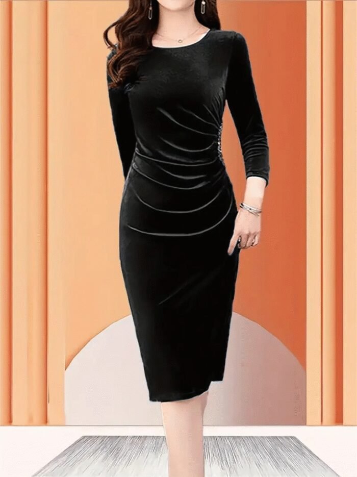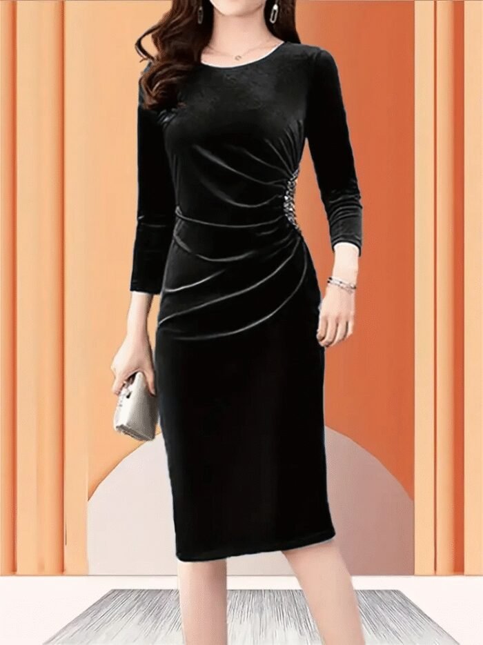 Kadın Uzun Kollu Bot Yaka Yanı Taş Detaylı Midi Kadife Elbise