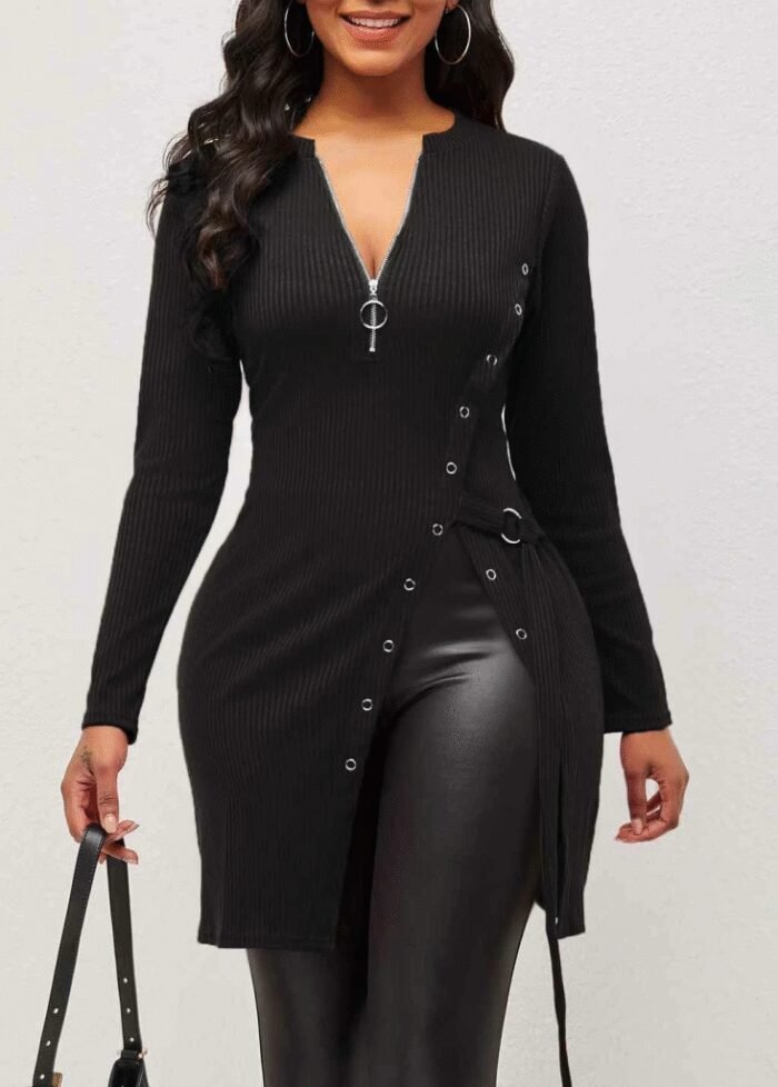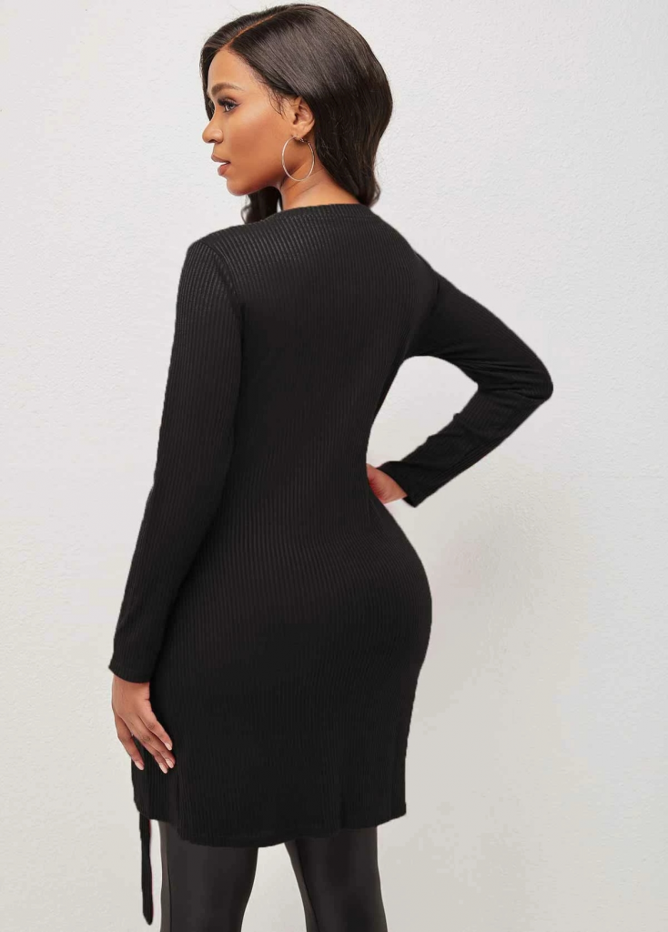 Kadın Uzun Kollu Fermuarlı Yan Yırtmaç çıtçıt Düğme Detay Fitilli Kaskorse Elbise