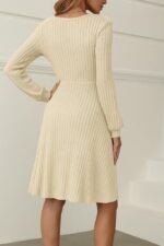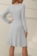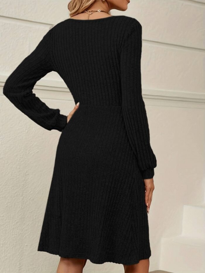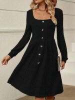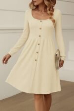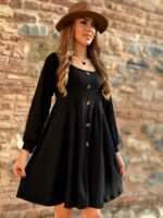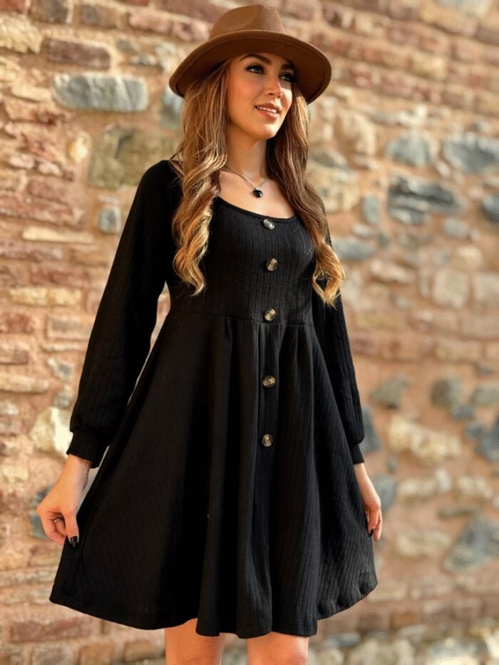 Kadın Uzun Kollu Kare Yaka Düğmeli Kısa şardonlu Iki Iplik Mini Elbise