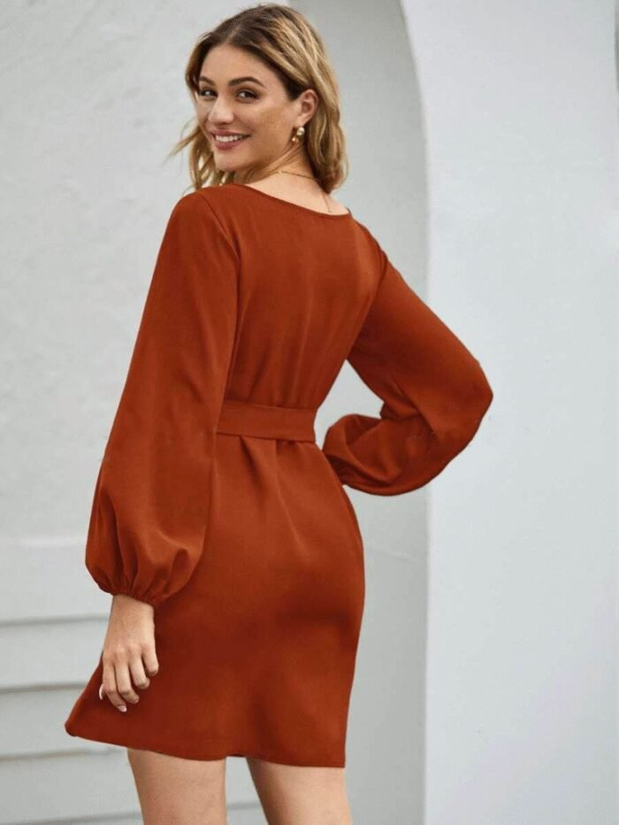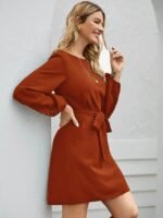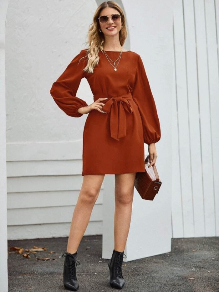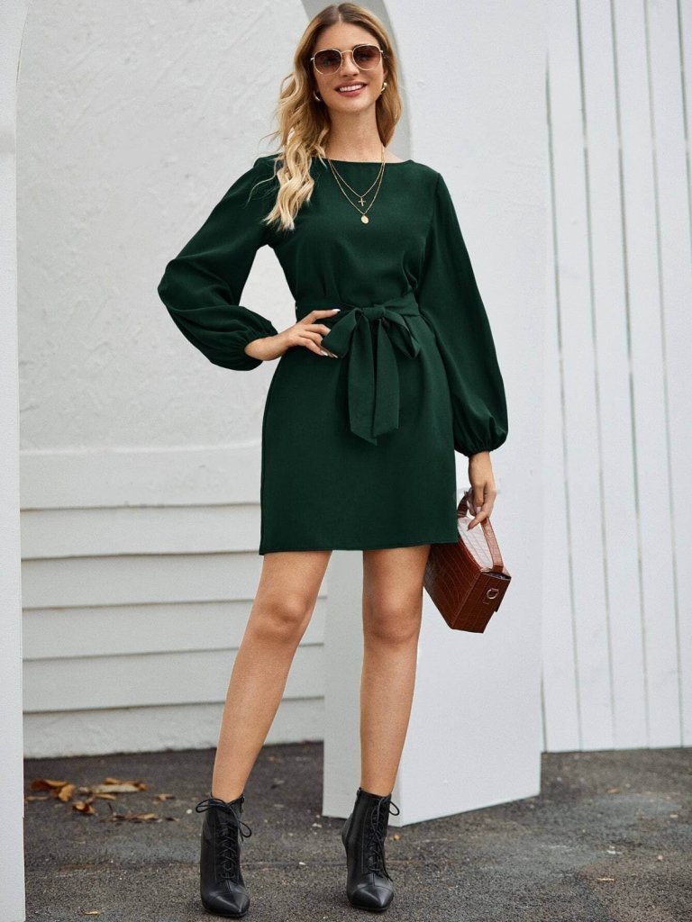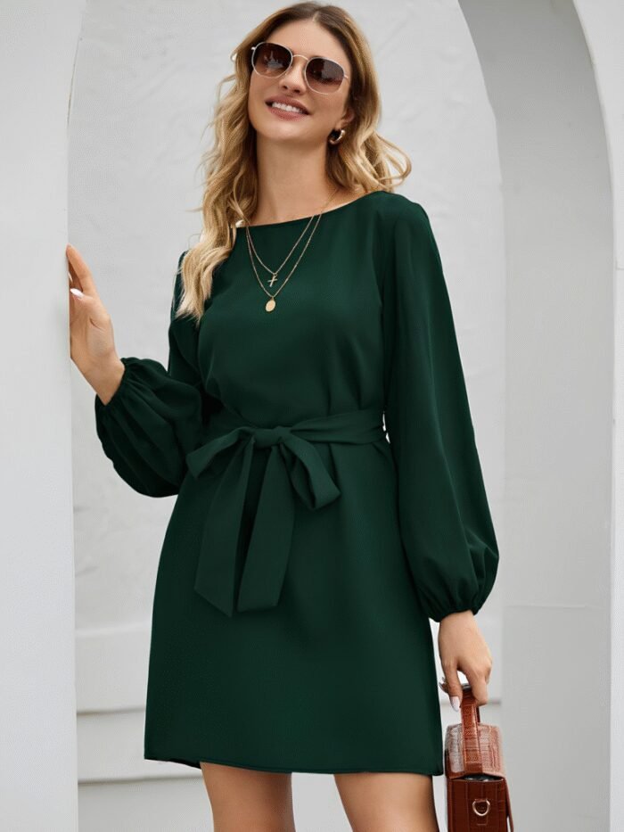 Kadın Uzun Kollu Kayık Yaka Belden Kuşaklı Kısa Ithal Krep Elbise
