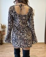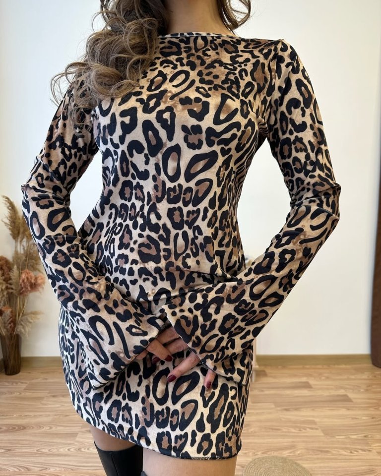 Kadın Uzun Kollu Kayık Yaka Leopar Baskılı Mini Elbise