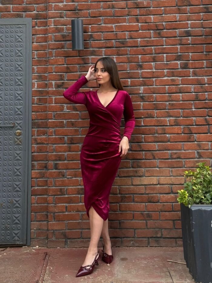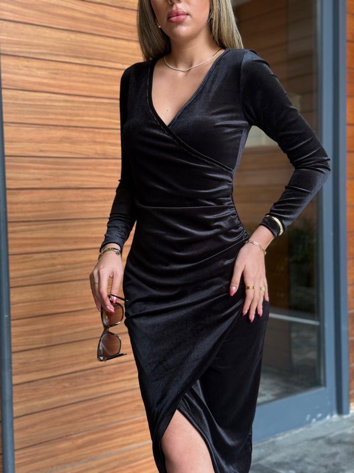 Kadın Uzun Kollu Kruvaze Yaka Belden Büzgü Detay Midi Kadife Elbise