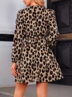 Kadın Uzun Kollu Kruvaze Yaka Kemerli Desenli Mini Leopar Elbise