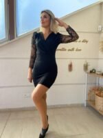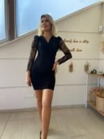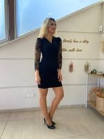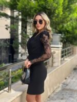 Kadın Uzun Kollu Kruvaze Yaka Kollar Tül Detay Krep Mini Boy Elbise
