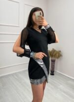 Kadın Uzun Kollu V Yakalı Pulpayetli Ithal Krep Elbise