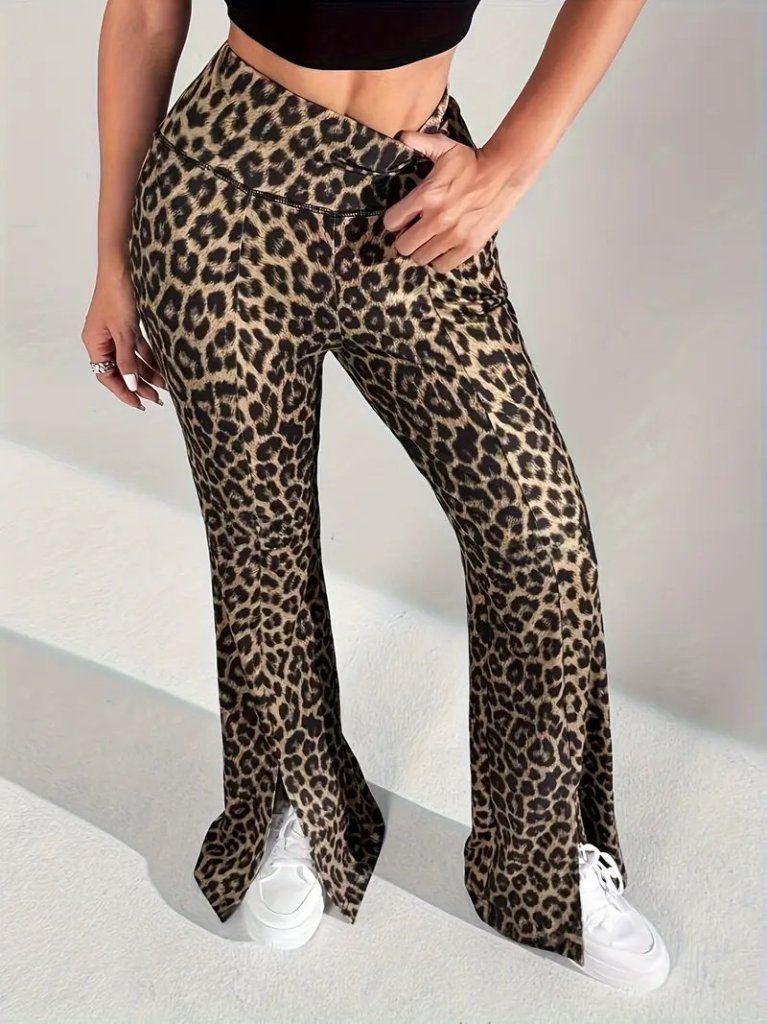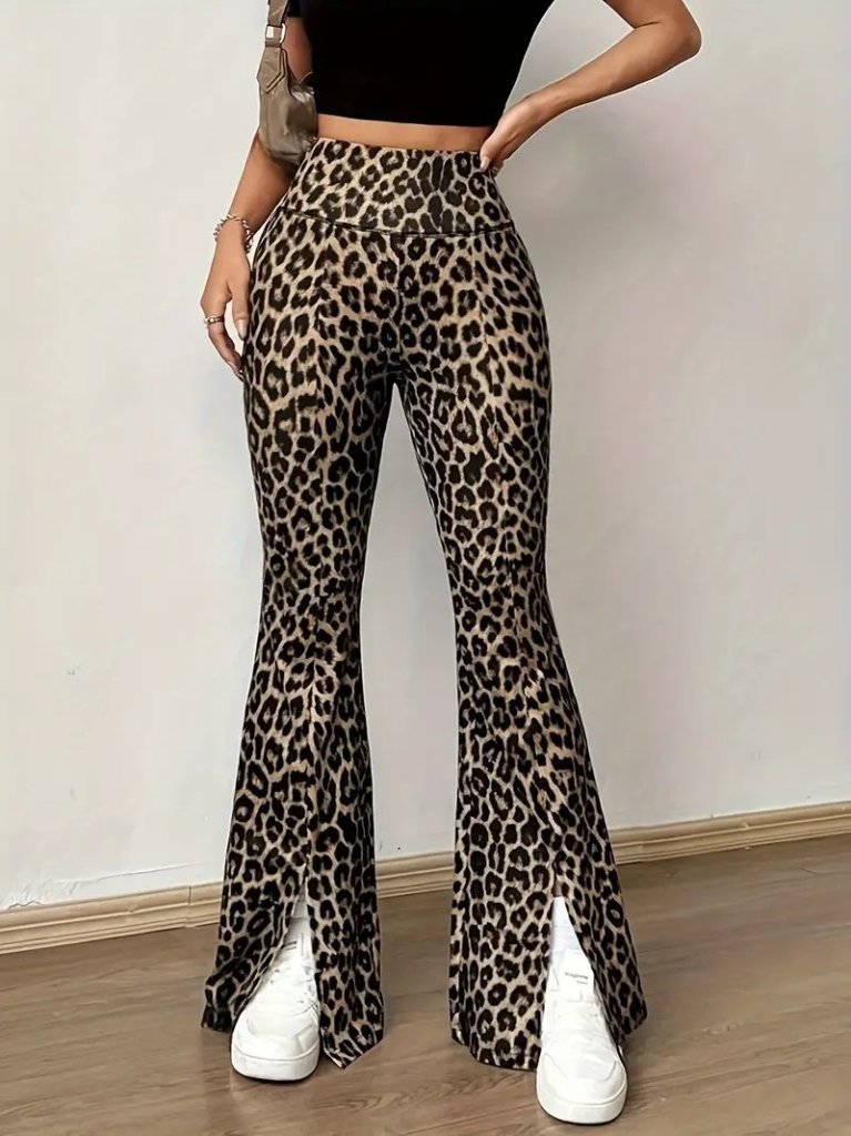 Kadın Yüksek Bel Leopar Desenli Yırtmaçlı Dalgıç Tayt