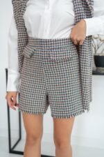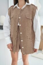 Kahverengi Kazayağı Desenli Yelek Ve Şort Takım