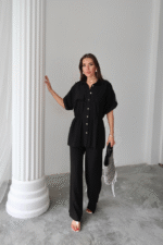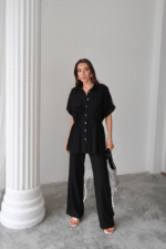 KETEN BELDEN BÜZGÜ DETAYLI GÖMLEK – PANTOLON TAKIM – Siyah