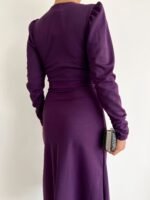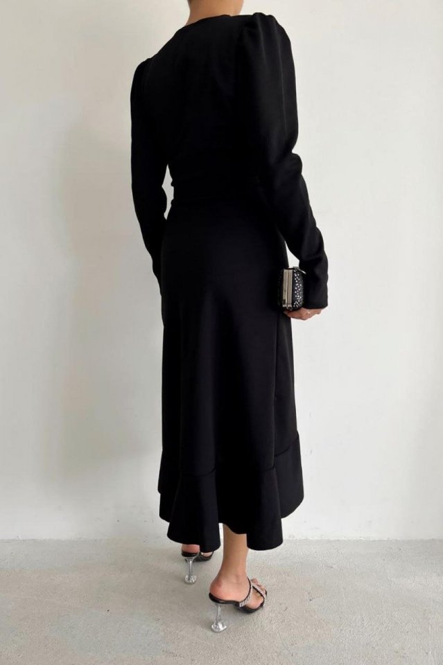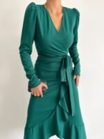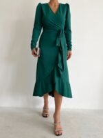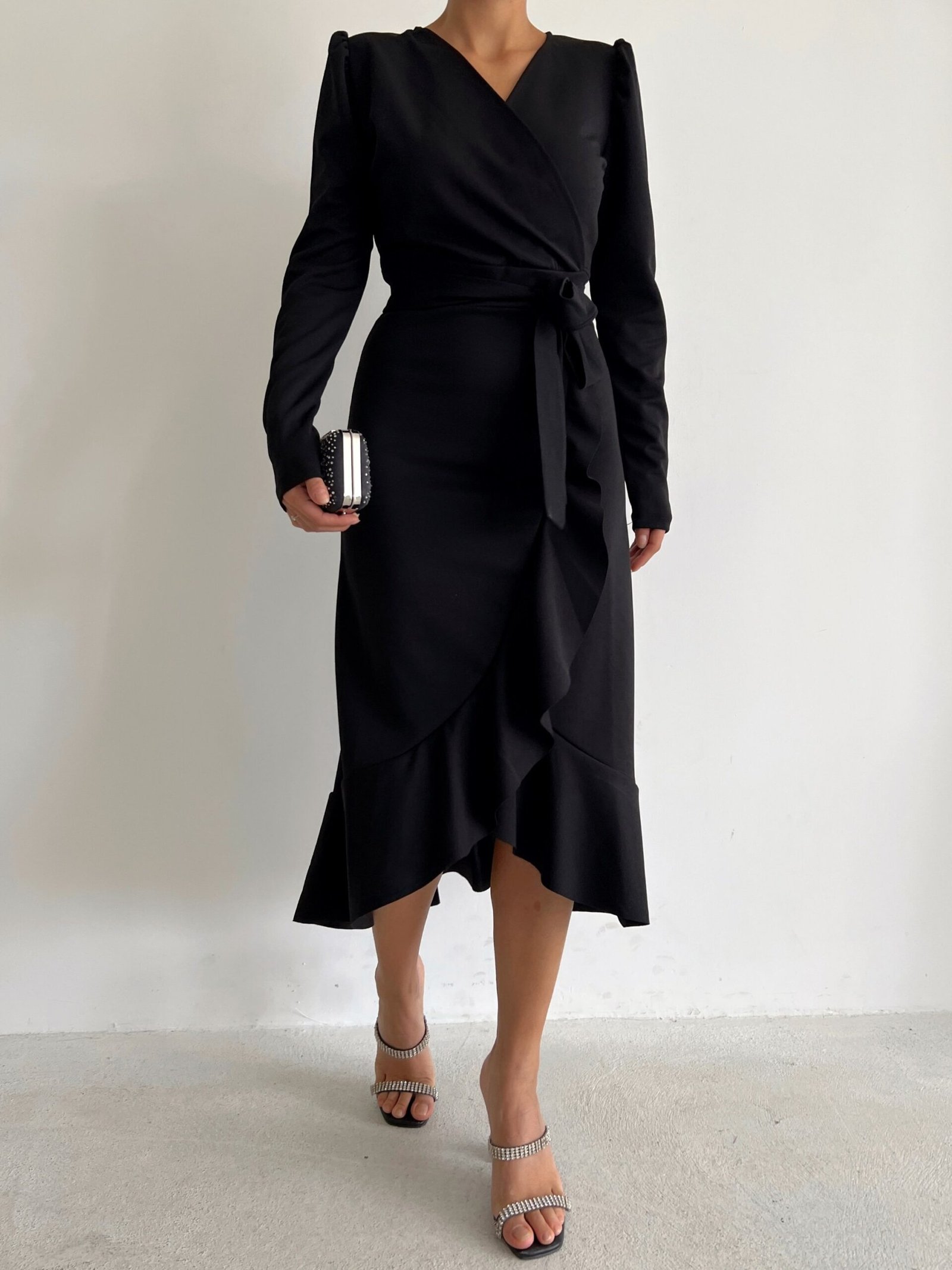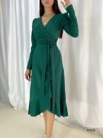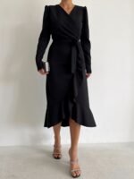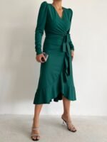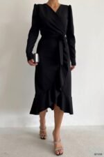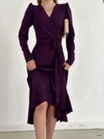 Krep Kumaş Midi Boy Kuşaklı Uzunkol Elbise