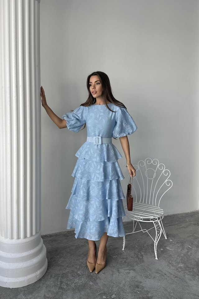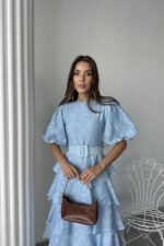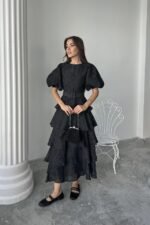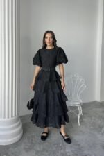 Siyah Kat Kat Balon Kollu Kemerli Elbise