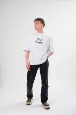 Unisex Bisiklet Yaka Baskılı Oversize T-Shirt – Beyaz