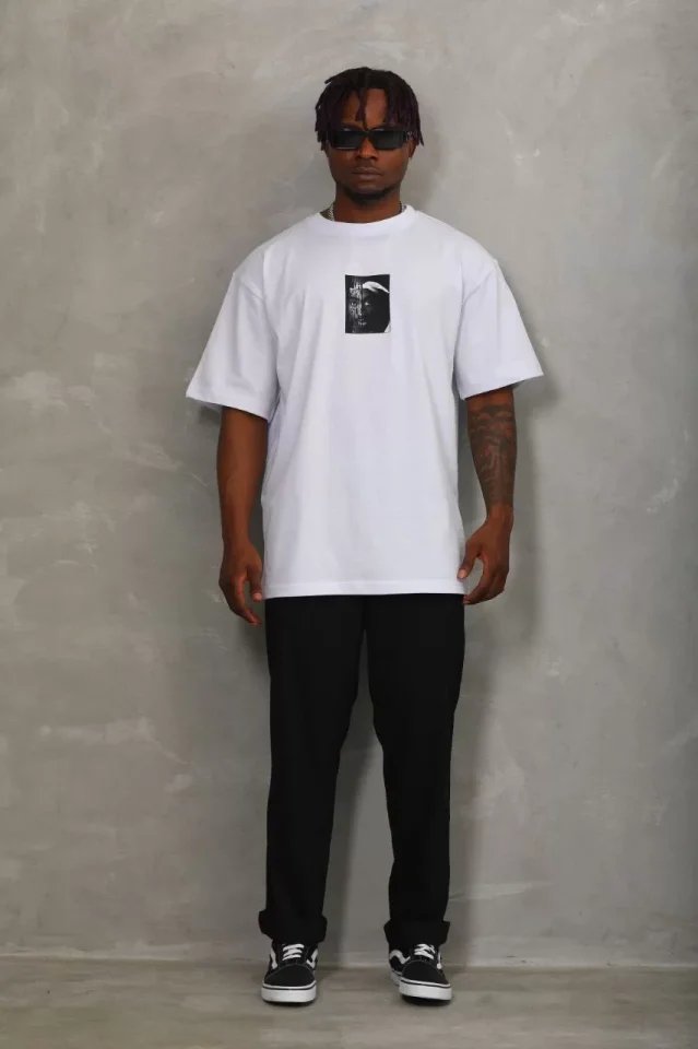 Unisex Oversize Baskılı Bisiklet Yaka T-Shirt – Beyaz