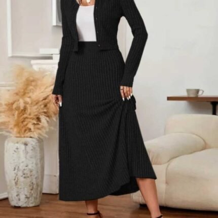 Kadın Uzun Kollu Düşük Omuz Yırtmaç Detay Kaşkorse Etek Bluz Ikili Takım