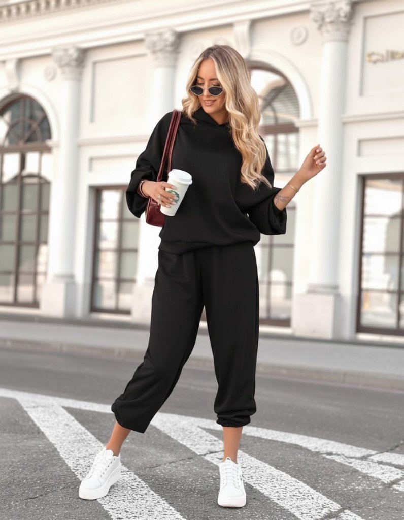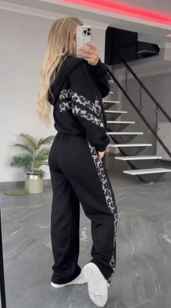 Kadın Uzun Kollu Kapşonlu Onu şerit Detaylı Fermuarlı Viskon Iki Iplik Bluz Ve Pantolon Ikili Takım