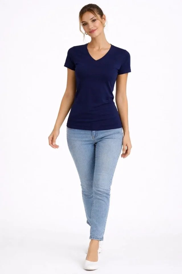 2li V Yaka Tişört – Kısa Kollu Yazlık Slim Fit Body – Lacivert – Ekru