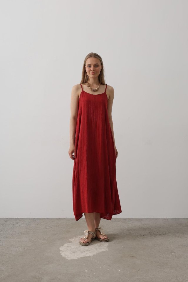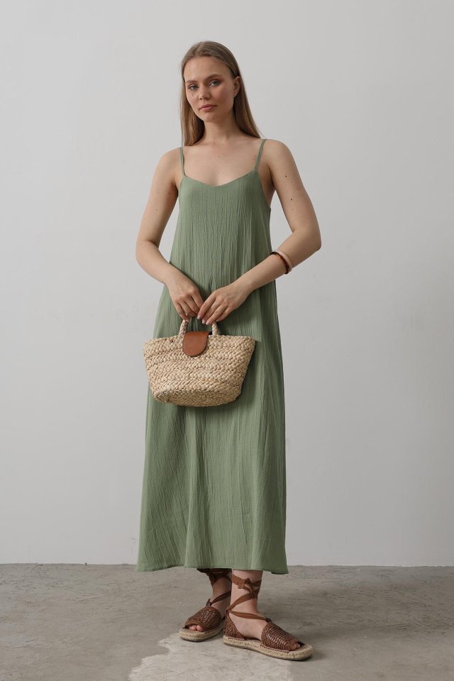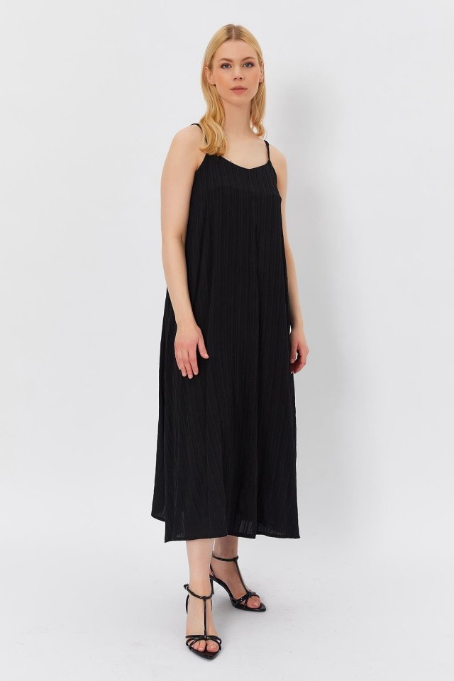 Kadın Kalın Askılı Kare Yaka Fitilli Kaşkorse Midi Boy Elbise