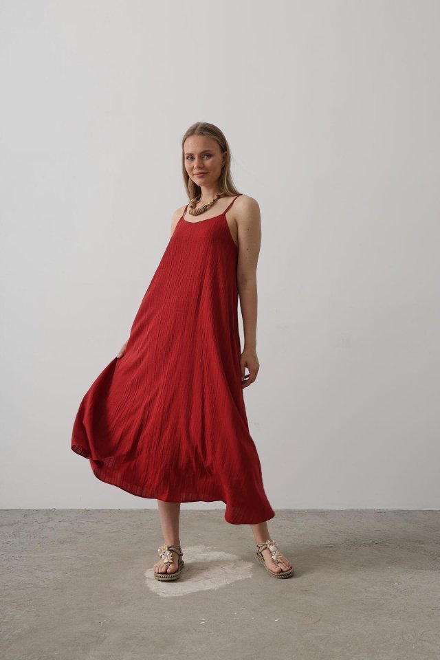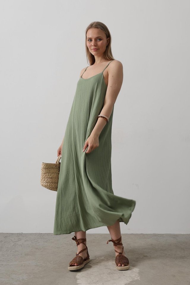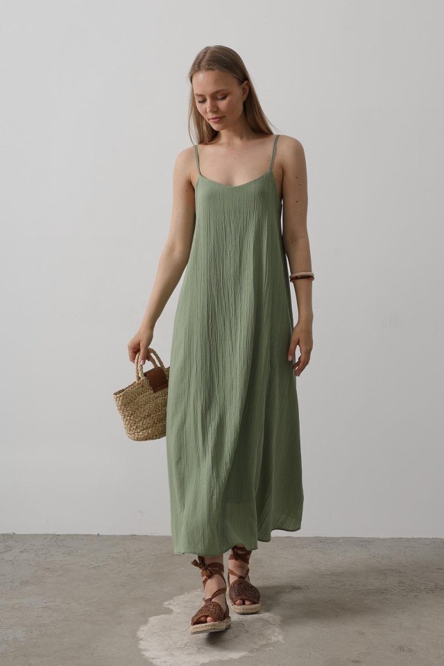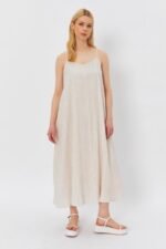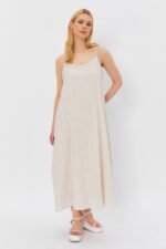 Askılı Uzun Çan Elbise – Natür