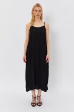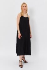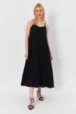 Kadın Askılı Geometrik Yakalı Geniş Kesim Detaylı Ithal Krep Elbise