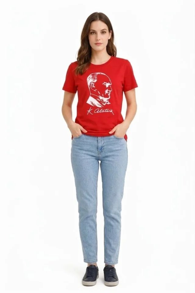 Atatürk Baskılı Tişört Kısa Kollu Bisiklet Yaka T-Shirt – Kırmızı