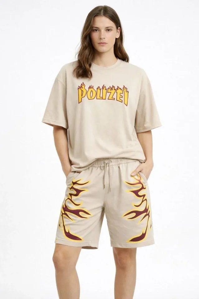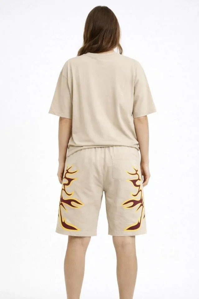 Bej Oversize Baskılı Tişört Şort Takım Cepli Şort Yazlık Rahat Günlük Kombin – Bej