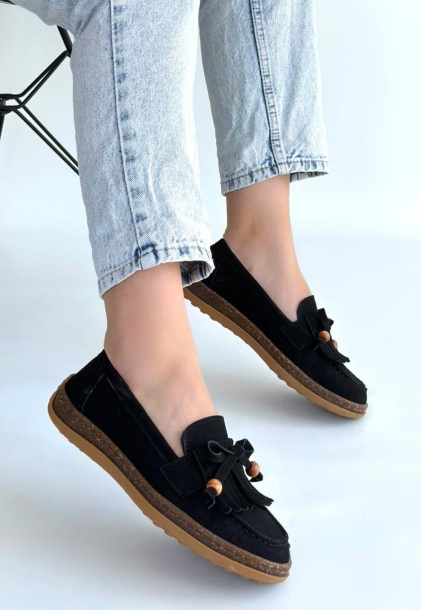 Boriy Siyah Deri Tozu Süet Babet Ayakkabı
