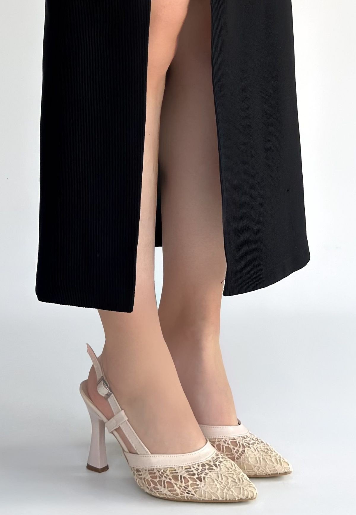 Ceta Bej Cilt Tül Detaylı Topuklu Ayakkabı
