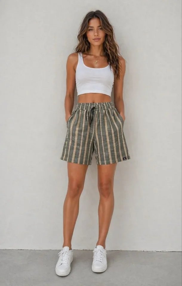 Çizgili Dokuma Şort Yüksek Bel Lastikli Cepli Yazlık Rahat Kesim – Haki