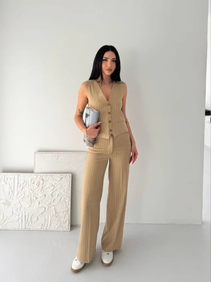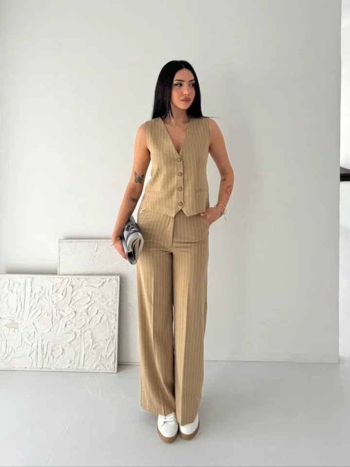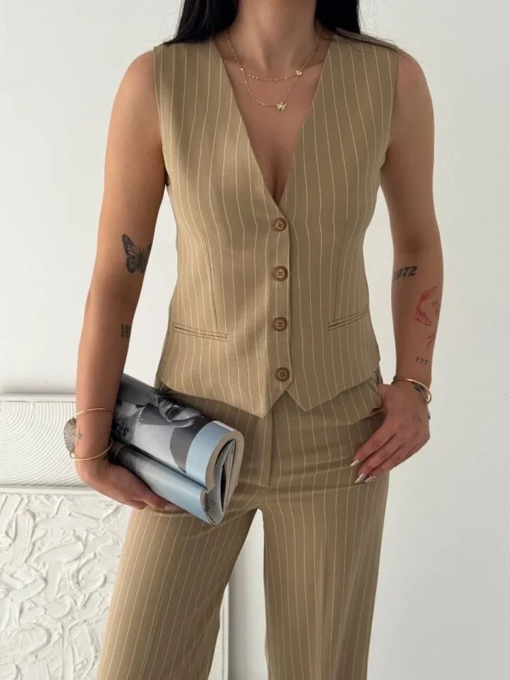 Çizgili Tansel Kumaş Yelek Pantolon İkili Takım Ofis Şık Modern – Bej