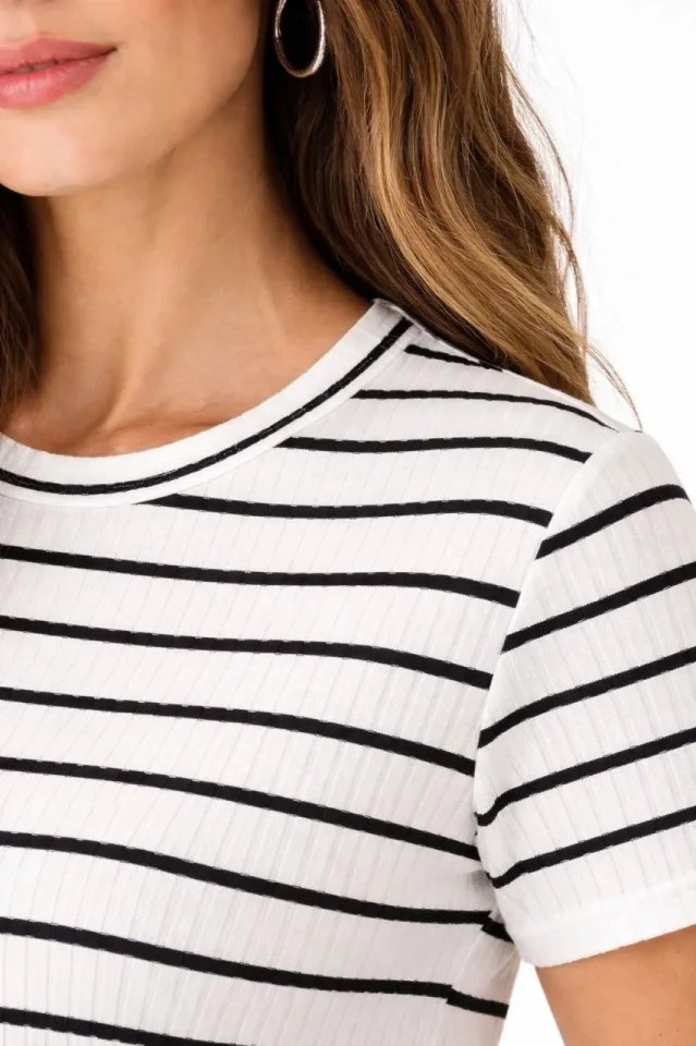 Çizgili Yazlık Triko T-Shirt Bisiklet Yaka Rahat Kalıp Tişört – Beyaz