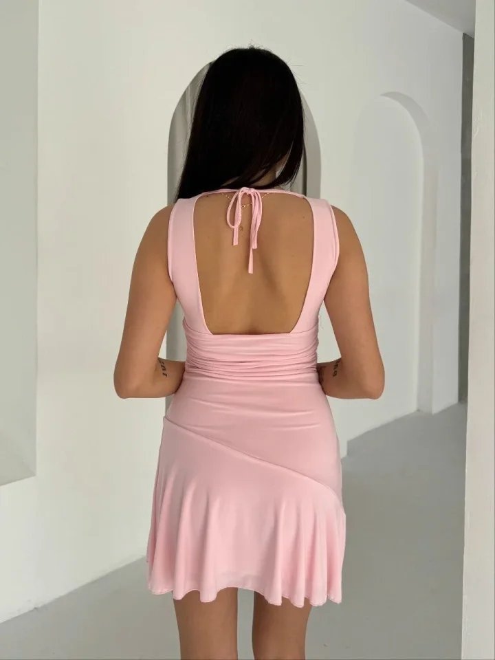 Derin V Yaka Sırt Dekolteli Mini Elbise Drapeli Şık Kolsuz – Pembe
